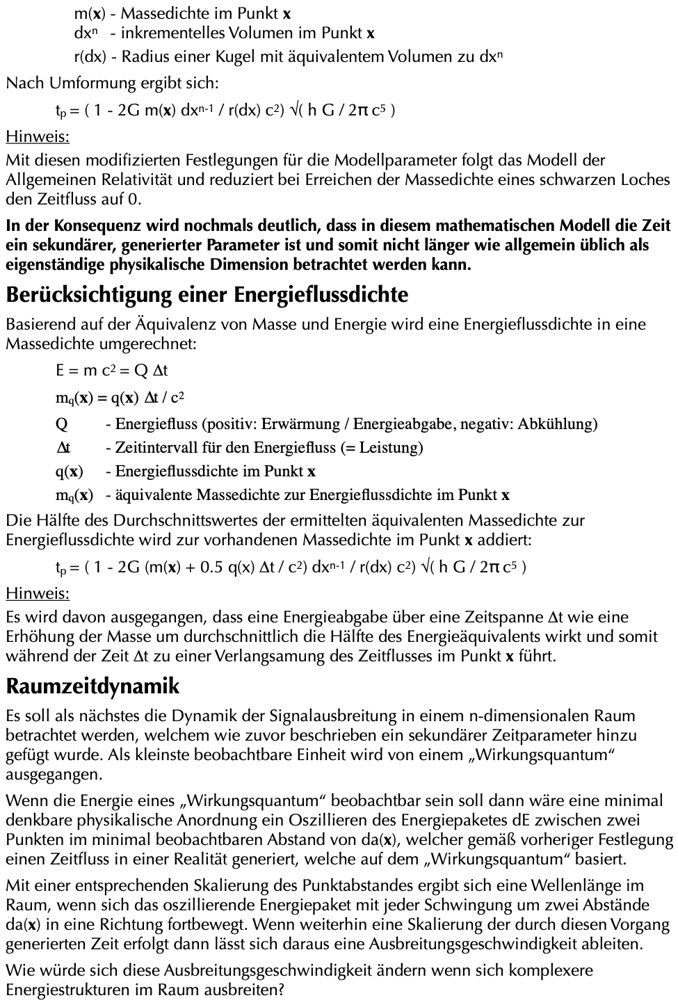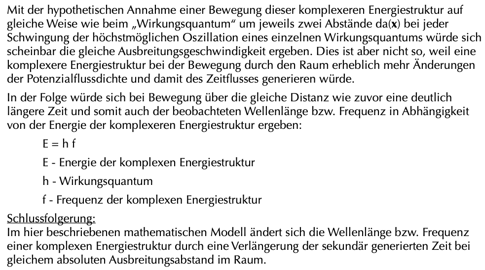 Die ZEIT ist ein quantisierter Vorgang. Jede Masse benötigt für eine Fortbewegung in der Zeit eine bestimmte Anzahl an Wirkungsquanten. In Anlehnung an das Formelzeichen h für das Plancksche Wirkungsquantum wurde ein großes H für die Anzahl der Wirkungsquanten gewählt:
